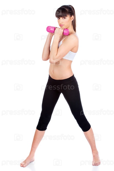 Женщина делает упражнение с гантелями