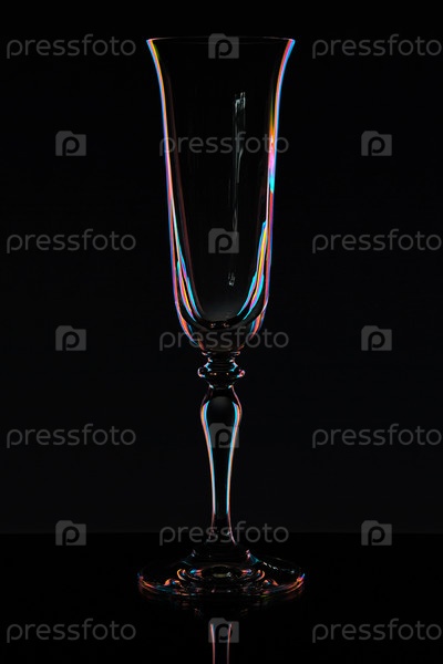 Пустой бокал для шампанского на черном фоне с радужной подсветкой