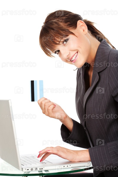 Предприниматель с кредитной картой печатает на клавиатуре