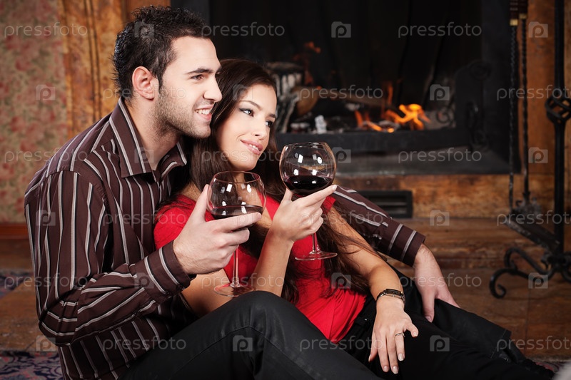 Молодая влюбленная пара наслаждается вином у камина