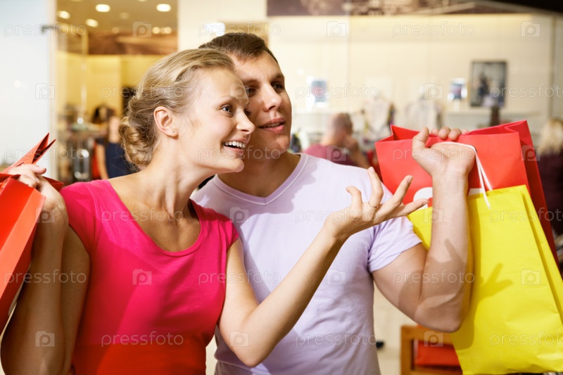 Счастливая семейная пара с покупками в торговом центре