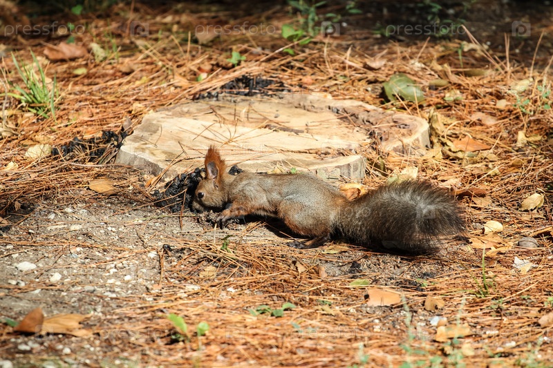 Белка собирает старые опята на пне