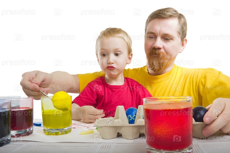 Мужчина и мальчик вытаскивают пасхальное яйцо из бокала краской