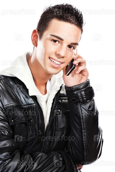 Симпатичный юноша говорит по мобильному телефону, изолированный на белом