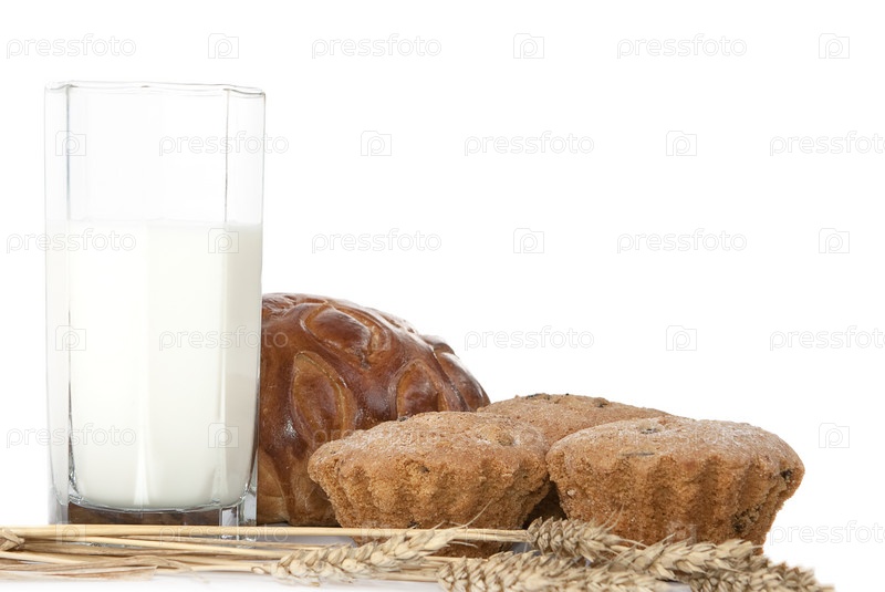 Стакан молока, хлеб, кексы и колосья пшеницы на белом фоне