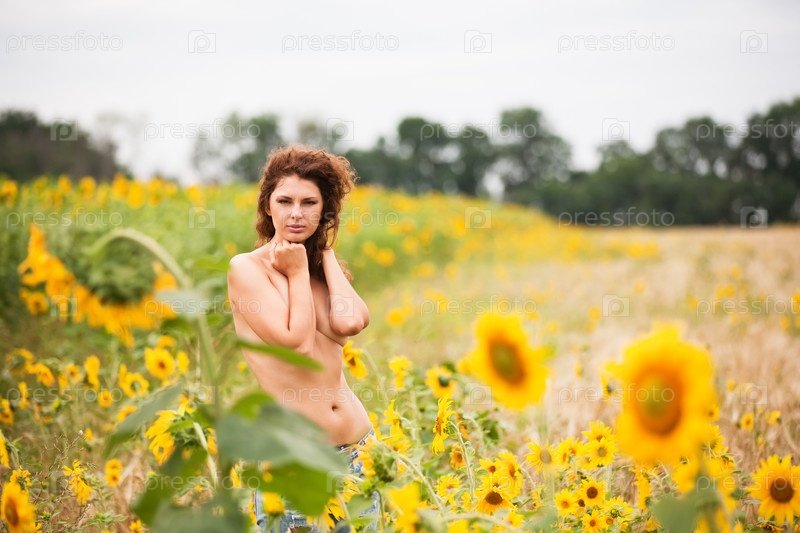 Красивая девушка топлес в подсолнухах