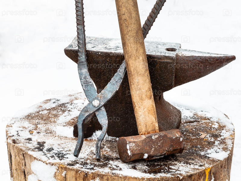 Наковальня, клещи кузнечные и молот в кузнице