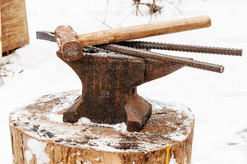 Наковальня, клещи кузнечные и молот в кузнице