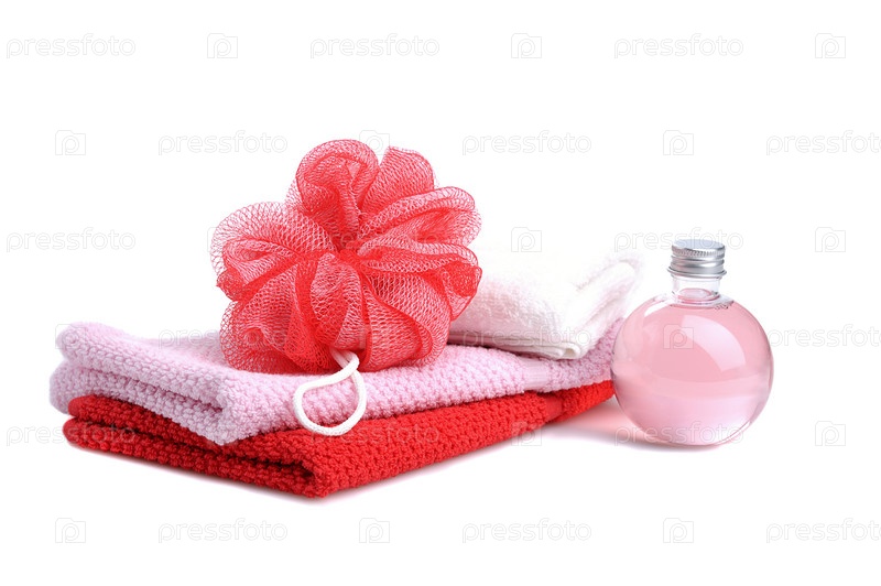 Полотенца, мочалка и розовое жидкое мыло на белом фоне