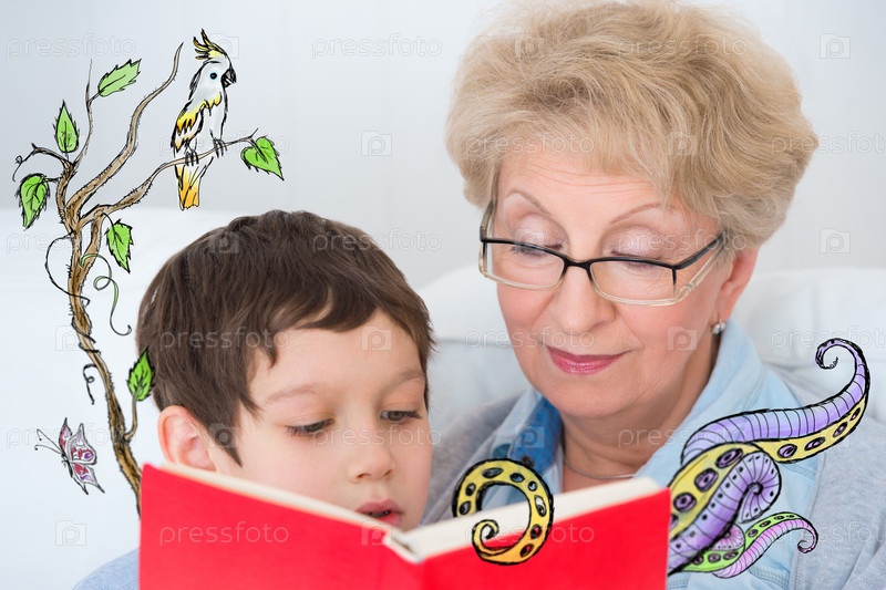 Счастливые мальчик и пожилая женщина читают книгу