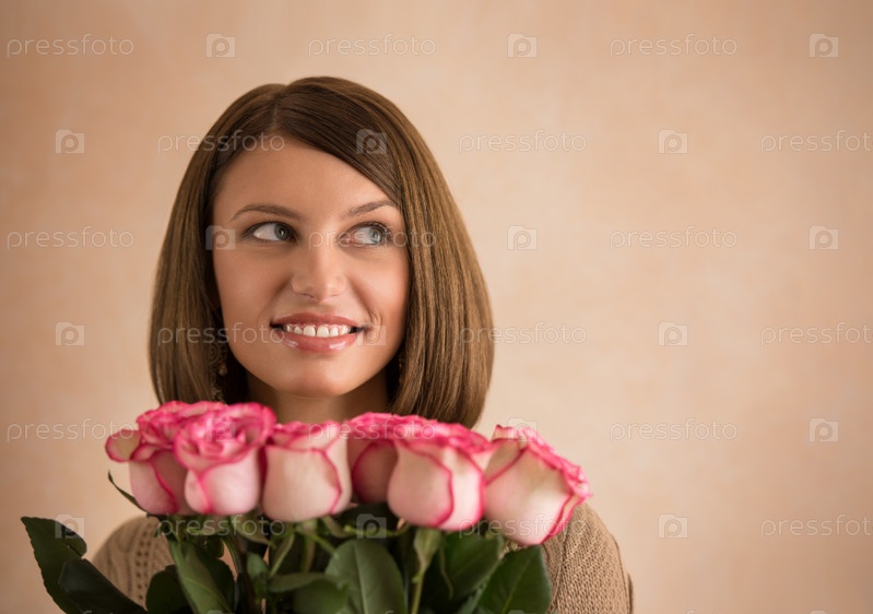 Симпатичная брюнетка держит букет роз
