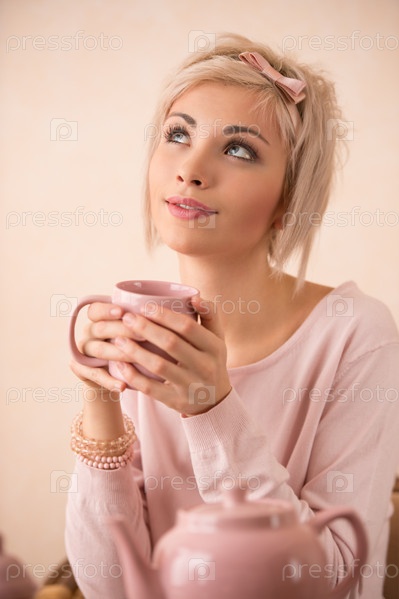 Молодая красивая женщина пьет чай