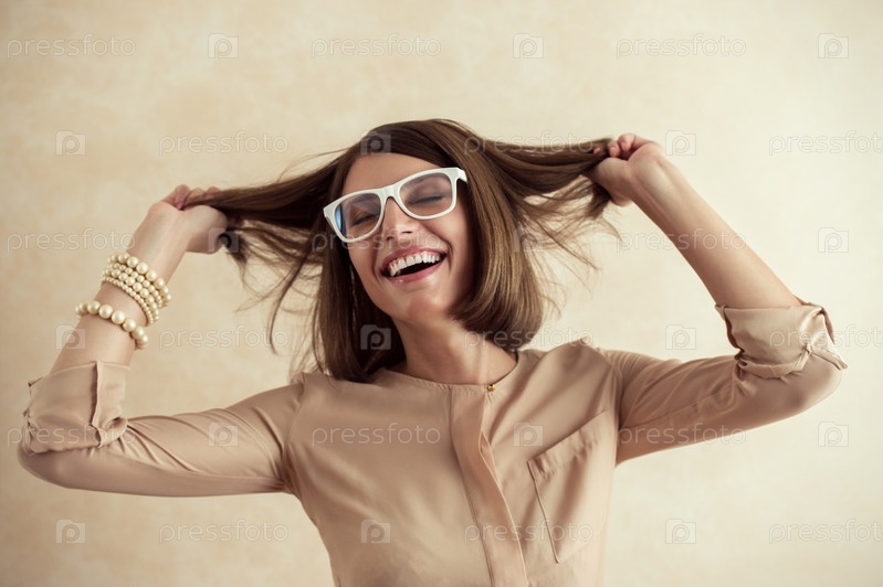Счастливая женщина танцует на бежевом фоне