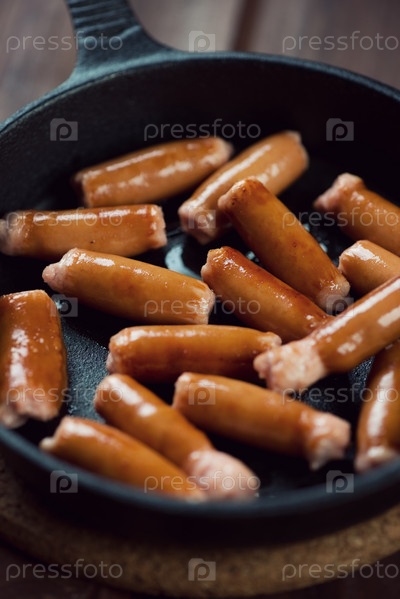 Жареные мини-колбаски в чугунной сковороде крупным планом