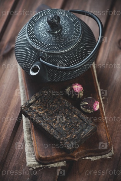 Прессованный чай и чугунный чайник на деревянном фоне