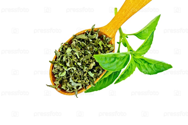 Зеленый свежий и сухой базилик в ложке