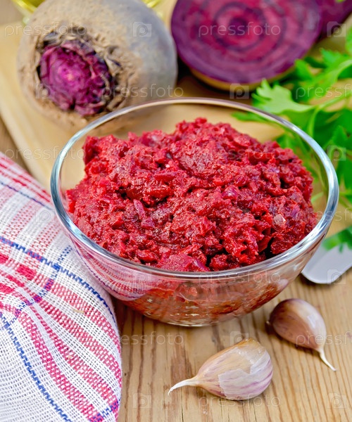 Свекольная икра в стеклянной посуде на доске