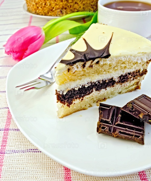 Торт с розовым тюльпаном и шоколадом на скатерти