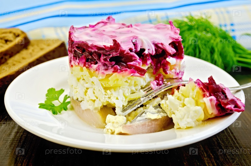Сельдь с овощами в белой тарелке на доске