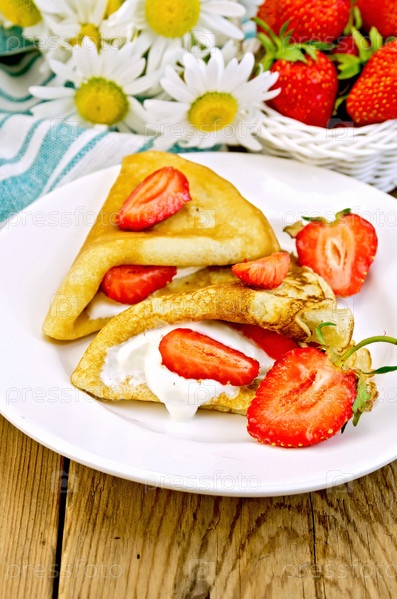 Блинчики с клубникой и сметаной на доске
