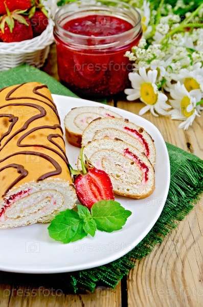 Рулет с клубникой и ромашками на доске