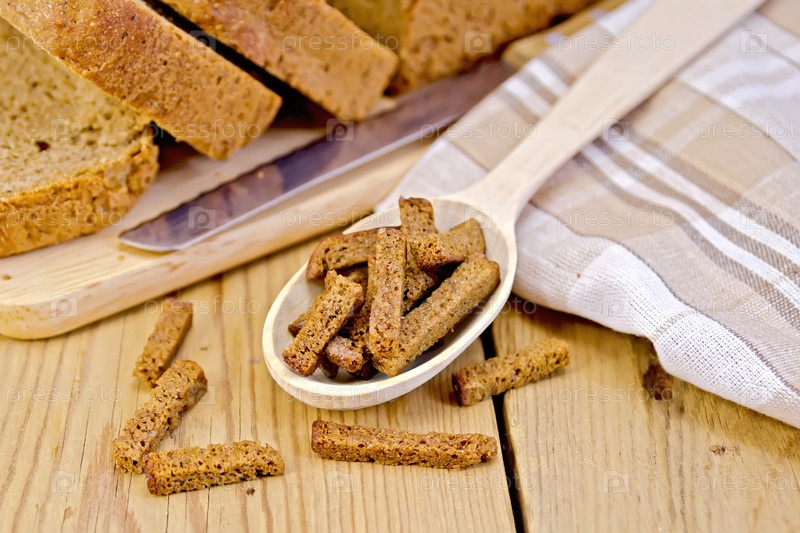 Ржаной домашний хлеб с сухариками в ложке на доске