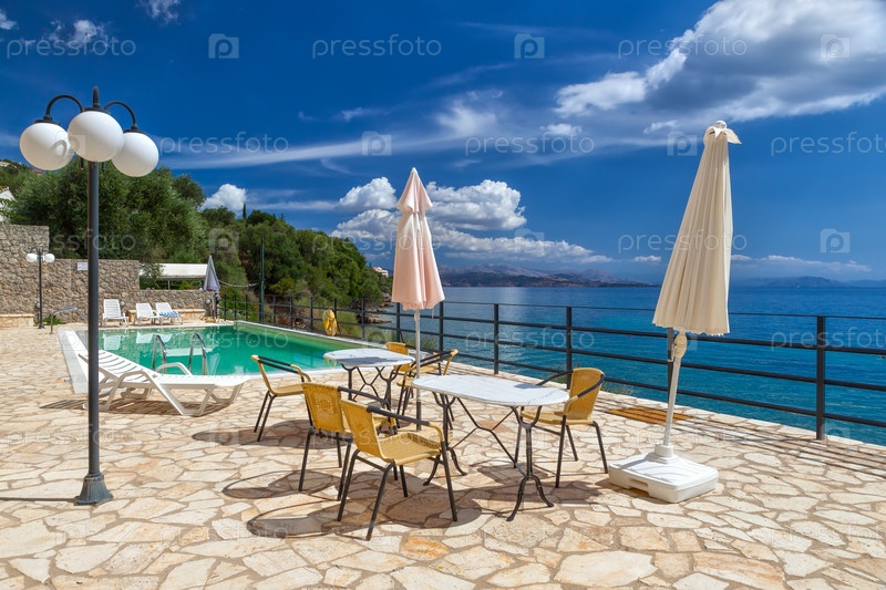 Столы и стулья стоят возле бассейна