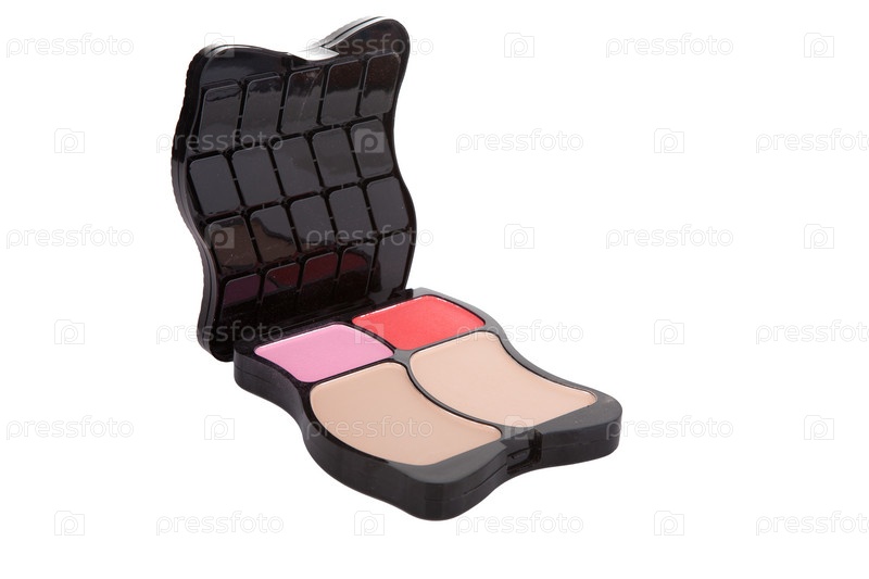 Пудра и румяна в коробке, изолированные на белом