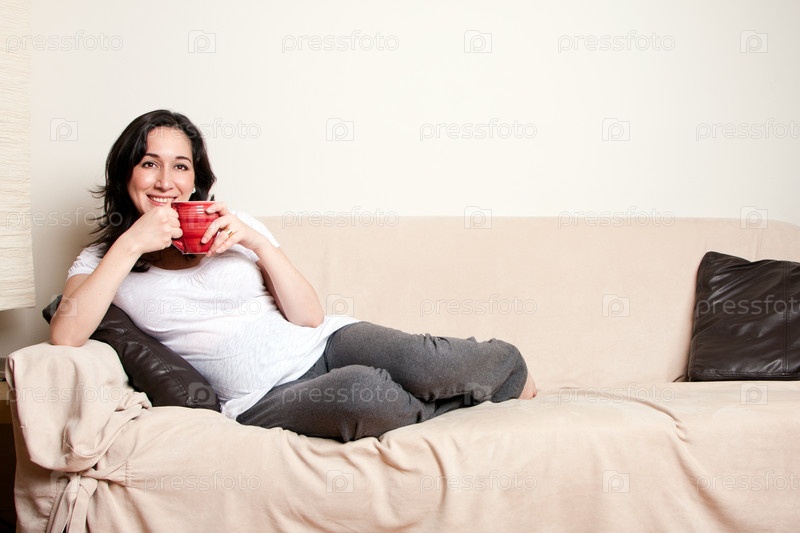 Женщина с напитком на диване
