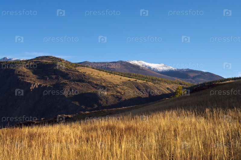 Живописный вид на заснеженные вершины гор и сухую траву долины