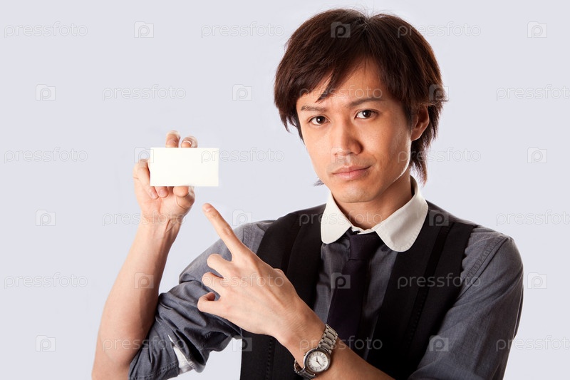 Азиатский бизнесмен указывает на белую визитку
