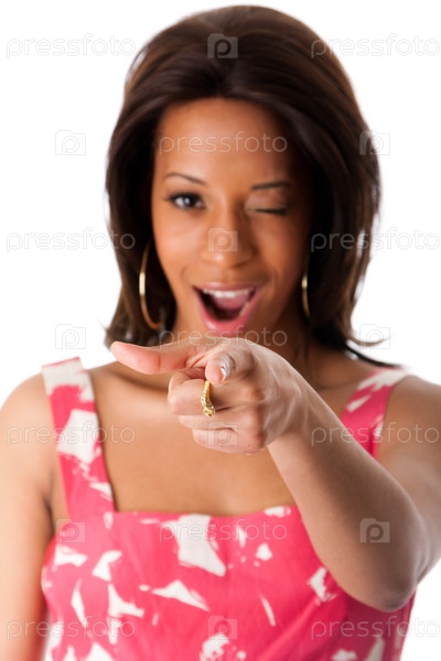 Темнокожая женщина показывает пальцем в камеру