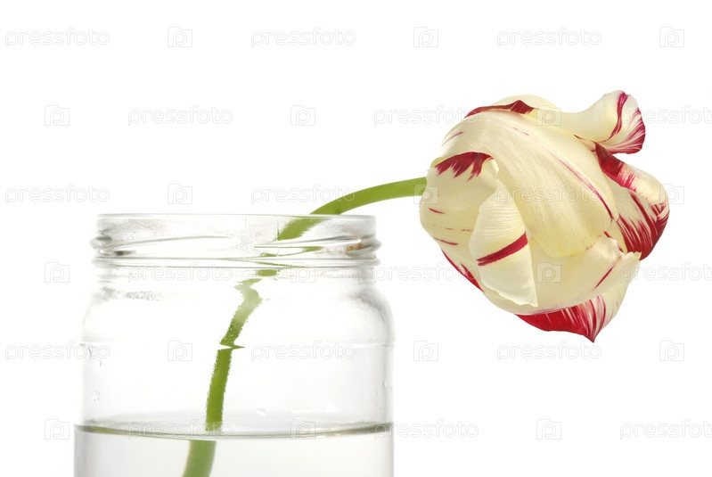 Тюльпан в стеклянной банке на белом фоне