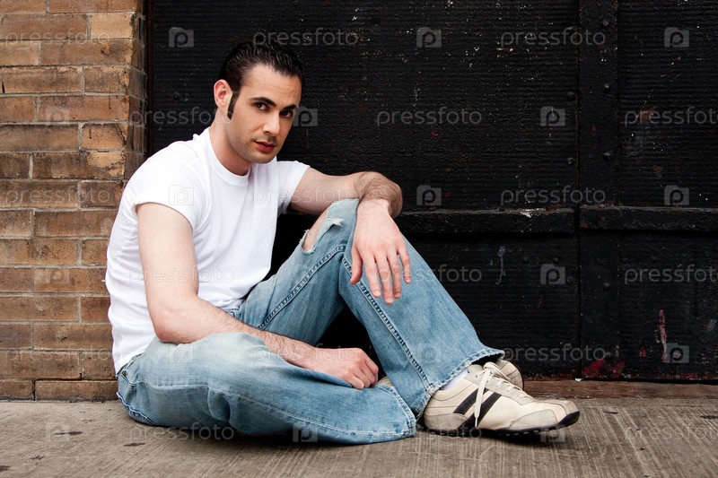 Мужчина сидит на тротуаре