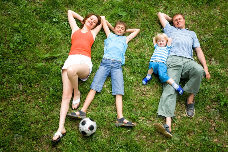 Изображение четырех человек, лежащих вместе на траве