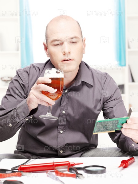 Мужчина пьет пиво и ремонтирует электронное устройство