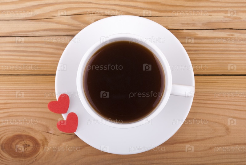 Чашка кофе и два сердечка на деревянном фоне