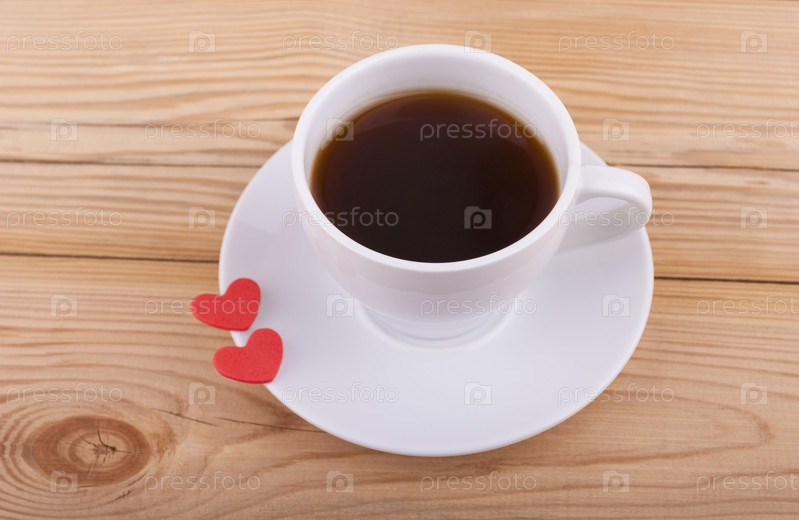 Чашка кофе и два сердечка на деревянном фоне