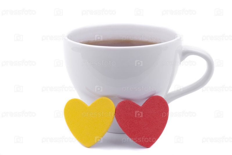 Чашка кофе и два сердечка на белом фоне