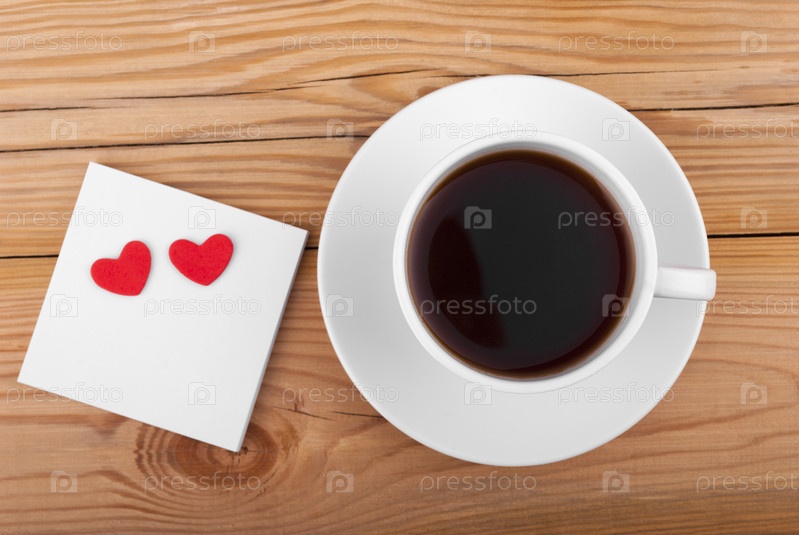 Чашка для кофе и сердечки на деревянном фоне