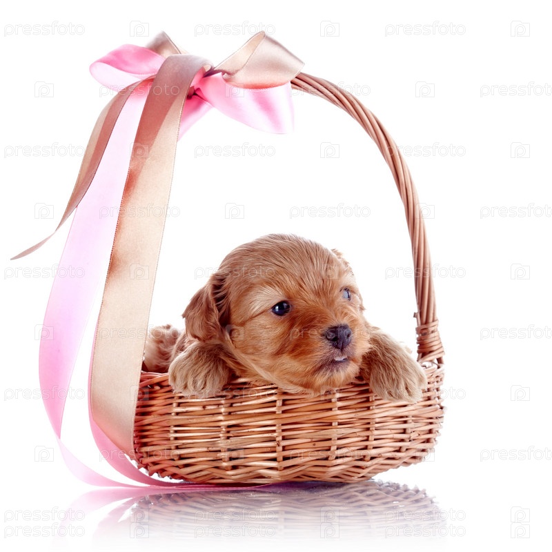 Щенок в плетеной корзине с бантиком