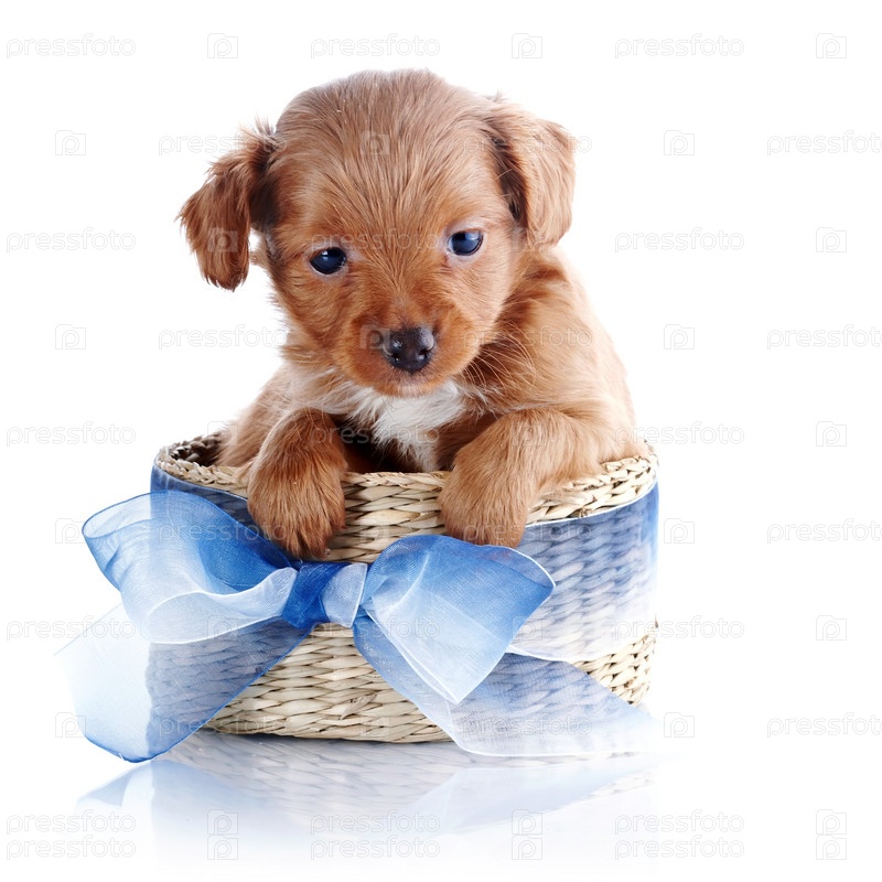 Щенок в плетеной корзине с голубым бантом