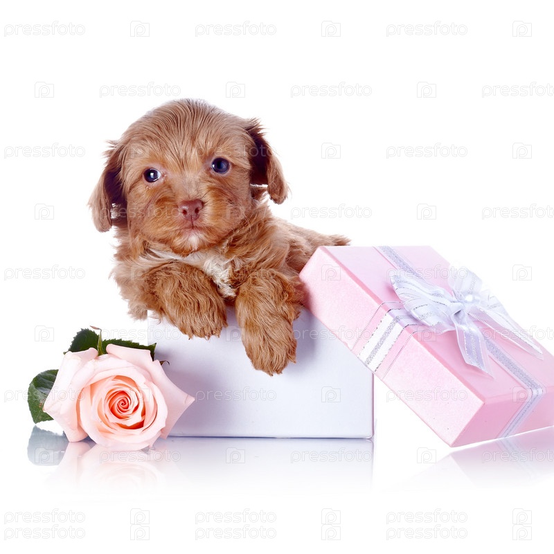 Щенок в подарочной коробке с бантиком и розой