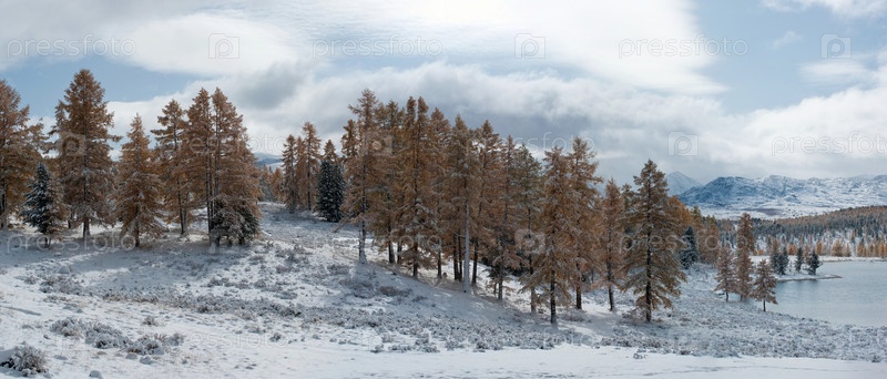 Панорамный вид на лес и озеро зимой
