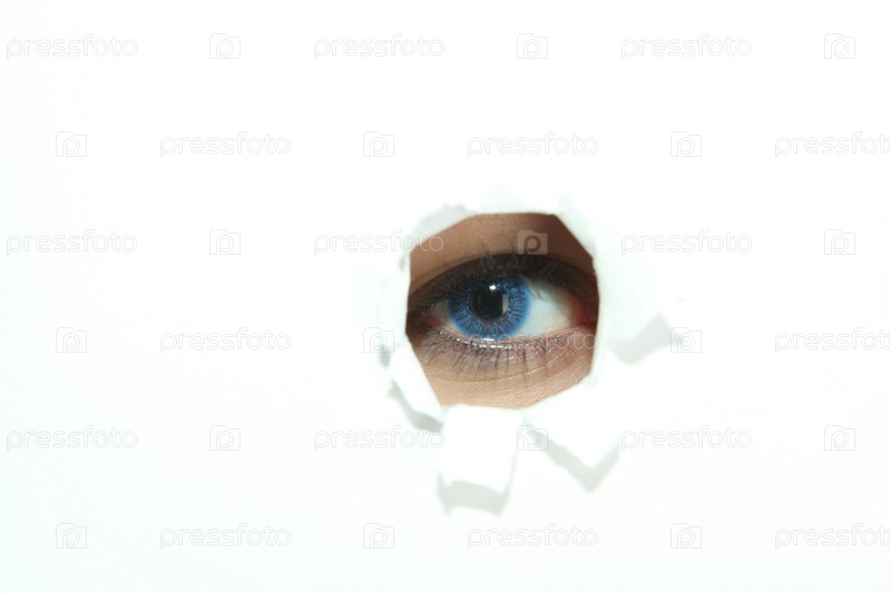 Глаз смотрит через отверстие в бумаге