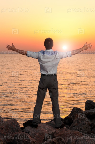 Мужчина с распростертыми руками стоит на берегу моря на закате