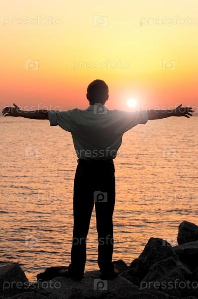 Мужчина с распростертыми руками стоит на берегу моря на закате