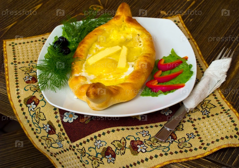 Хачапури по-аджарски на столе с сервировкой
