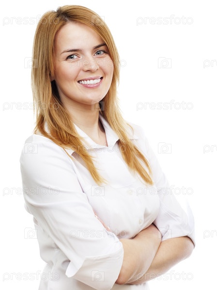 Красивая рыжеволосая женщина в белой блузке на белом фоне