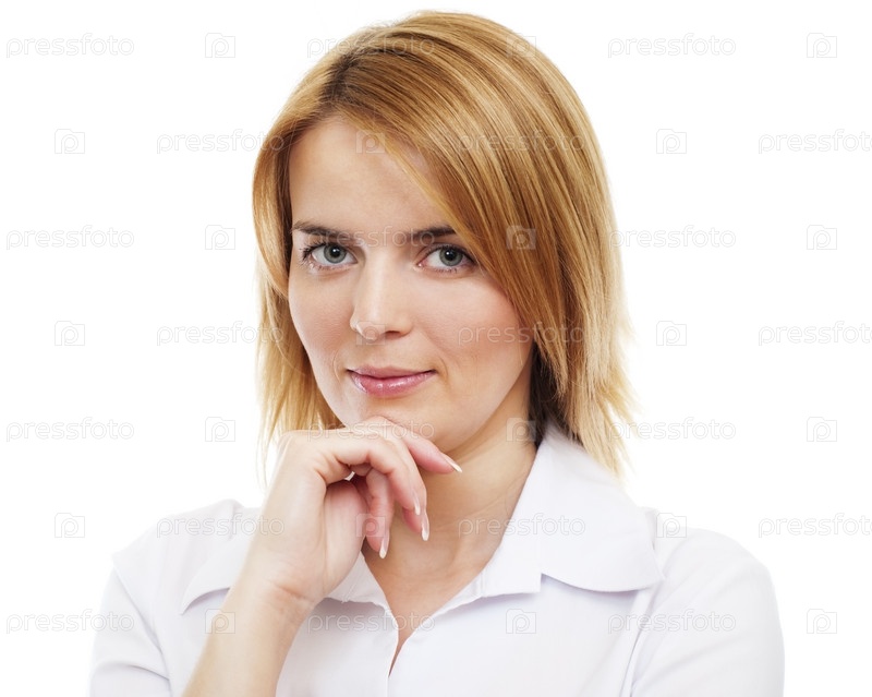 Задумчивая рыжеволосая женщина на белом фоне